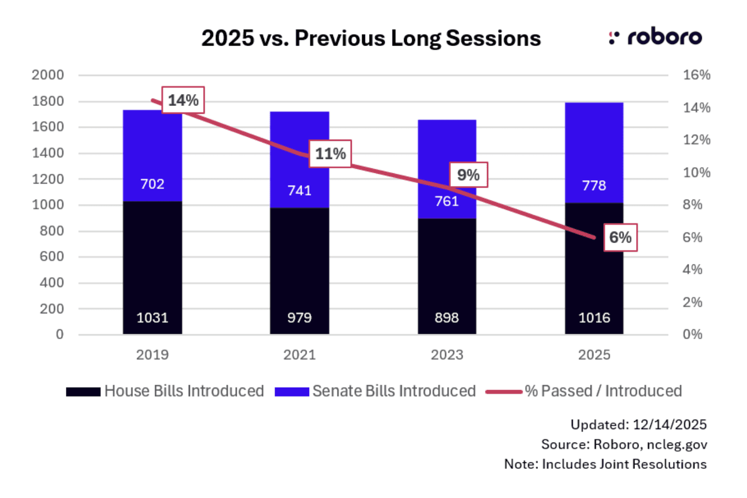 By the numbers, at least, that is correct. Compared to the last 3 long sessions, the NCGA has introduced more bills but has been significantly less likely to pass bills – only 6% of bills passed in 2025, compared to 9% passed by this time in 2023, 11% passed in 2021, and 14% passed in 2019.
