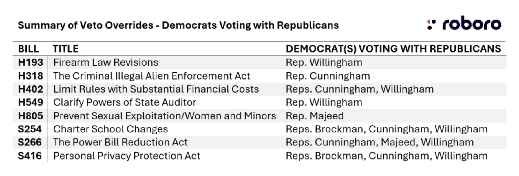 To recap, here’s the breakdown of Democrats who voted with Republicans to override 8 vetoes in 2025, next to Roboro’s early session analysis: